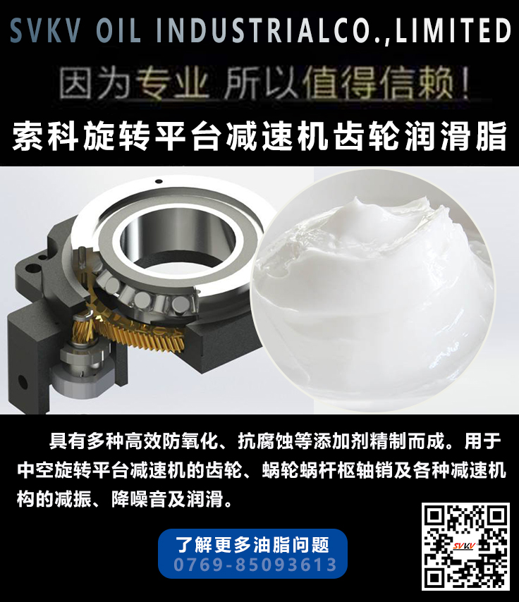 索科中空旋轉平臺交叉滾子軸承潤滑脂 是由全合成油和獨特的添加劑制成,具有強韌的油膜,生成的潤滑油膜可在軸承運行中持久有效地保持軸承內部摩擦表面的分離,確保軸承少磨損甚至無磨損地運行。用于中空旋轉平臺減速機交叉滾子軸承使用。適應性好,具有高低溫性能,南北方通用;啟動力矩小,運轉力矩低,功耗少,溫升低;優(yōu)異的重載潤滑能力,優(yōu)異的熱穩(wěn)定性和機械穩(wěn)定性;可用于耐沖擊負荷及磨損,具有良好的防銹作用;可用于防止振動,擺動腐蝕及延長潤滑周期;抗老化能力強,可提高機械因連續(xù)運行安全可靠性。