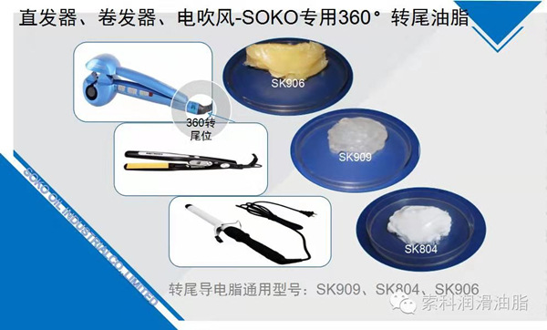 SVKV索科轉(zhuǎn)尾油脂專為直發(fā)器/卷發(fā)器360度無(wú)死角長(zhǎng)效應(yīng)用,有效減少磨損,對(duì)塑膠及貴金屬無(wú)化學(xué)反應(yīng),SVKV索科專用轉(zhuǎn)尾油脂SK909 和SK908系列/電源線轉(zhuǎn)動(dòng)部位接點(diǎn)潤(rùn)滑油廣泛應(yīng)用于各大國(guó)際知名品牌廠的直發(fā)器、自動(dòng)卷發(fā)神器中。
