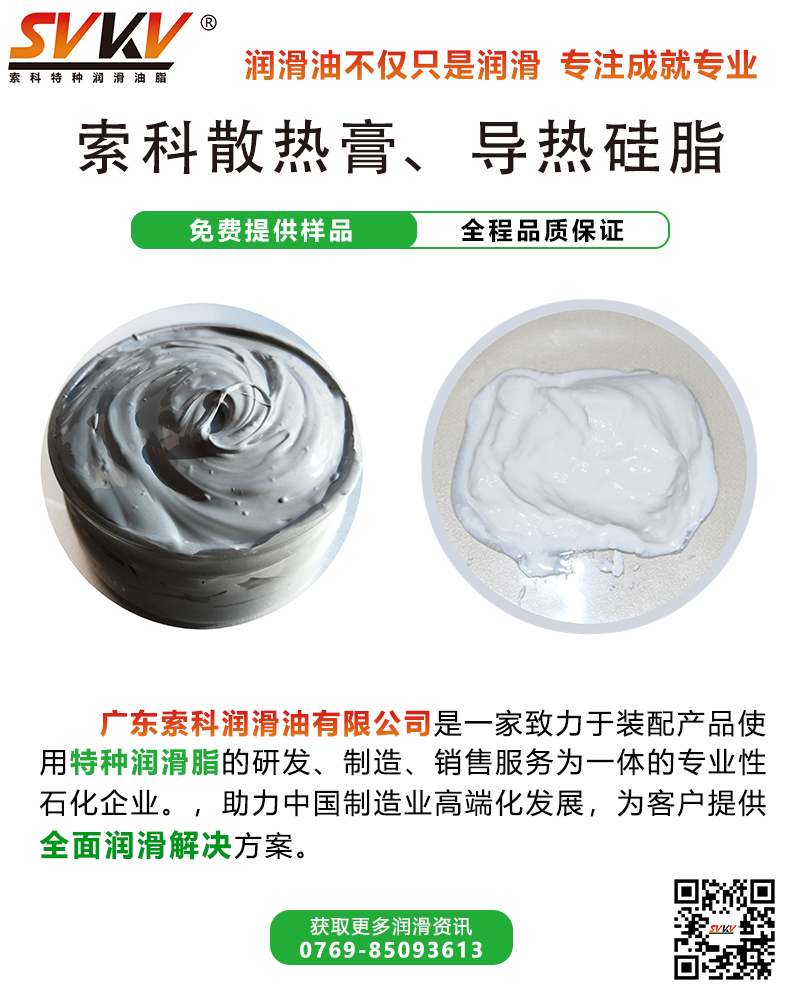 SVKV索科系列導(dǎo)熱硅脂適用溫度廣泛,不易出現(xiàn)風(fēng)干硬化或熔化現(xiàn)象,同時具有耐高低溫能力。主要用于填充發(fā)熱體與散熱片之間的空隙,提高散熱效果,改善電子/電氣器件向散熱器或底盤的熱轉(zhuǎn)移,增加器件的總體效能。 SVKV索科導(dǎo)熱硅脂性能特點