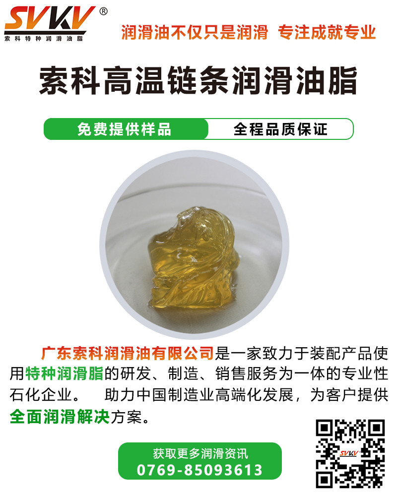 SVKV索科高溫鏈條油脂是以優(yōu)質(zhì)基礎(chǔ)油、添加抗氧、抗磨、防銹等添加劑調(diào)制而成。索科高溫鏈條油可承受極高溫,不易洗掉和燒毀受保護(hù)涂層,對金屬零件具有極好的防腐蝕、防磨損、防水、防銹等特性,在高溫下抗氧化不冒煙、不積碳、防止金屬燒結(jié)卡死的消音和長效潤滑作用。