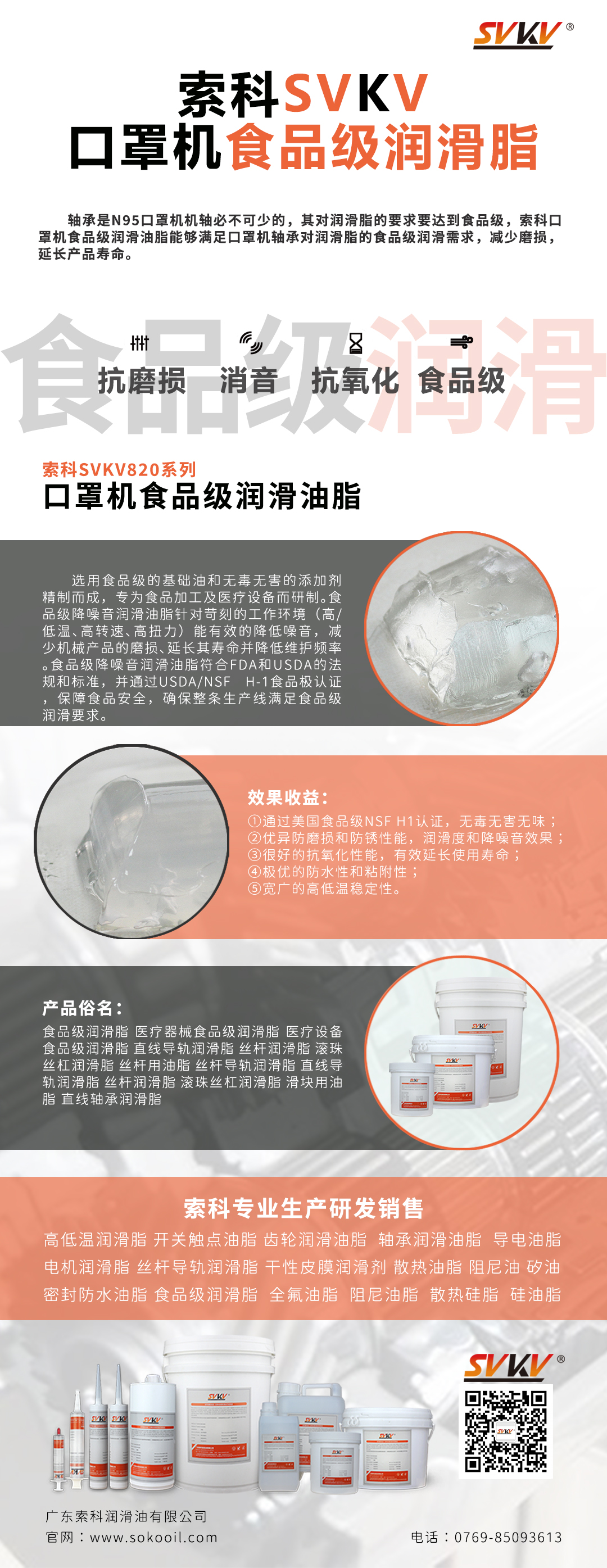 索科為企業(yè)提供潤滑方案,降本增效,適合的潤滑油脂能有效減少磨損,延長產品壽命。索科提供口罩機食品級潤滑油脂0769-85093613免費樣品,全程品質保證!